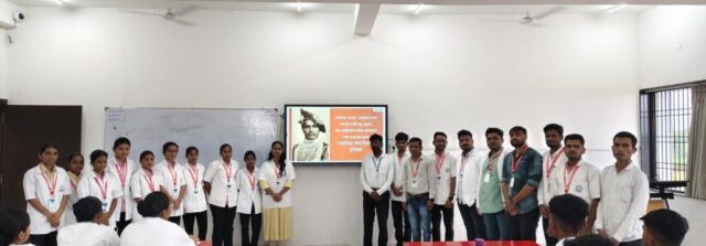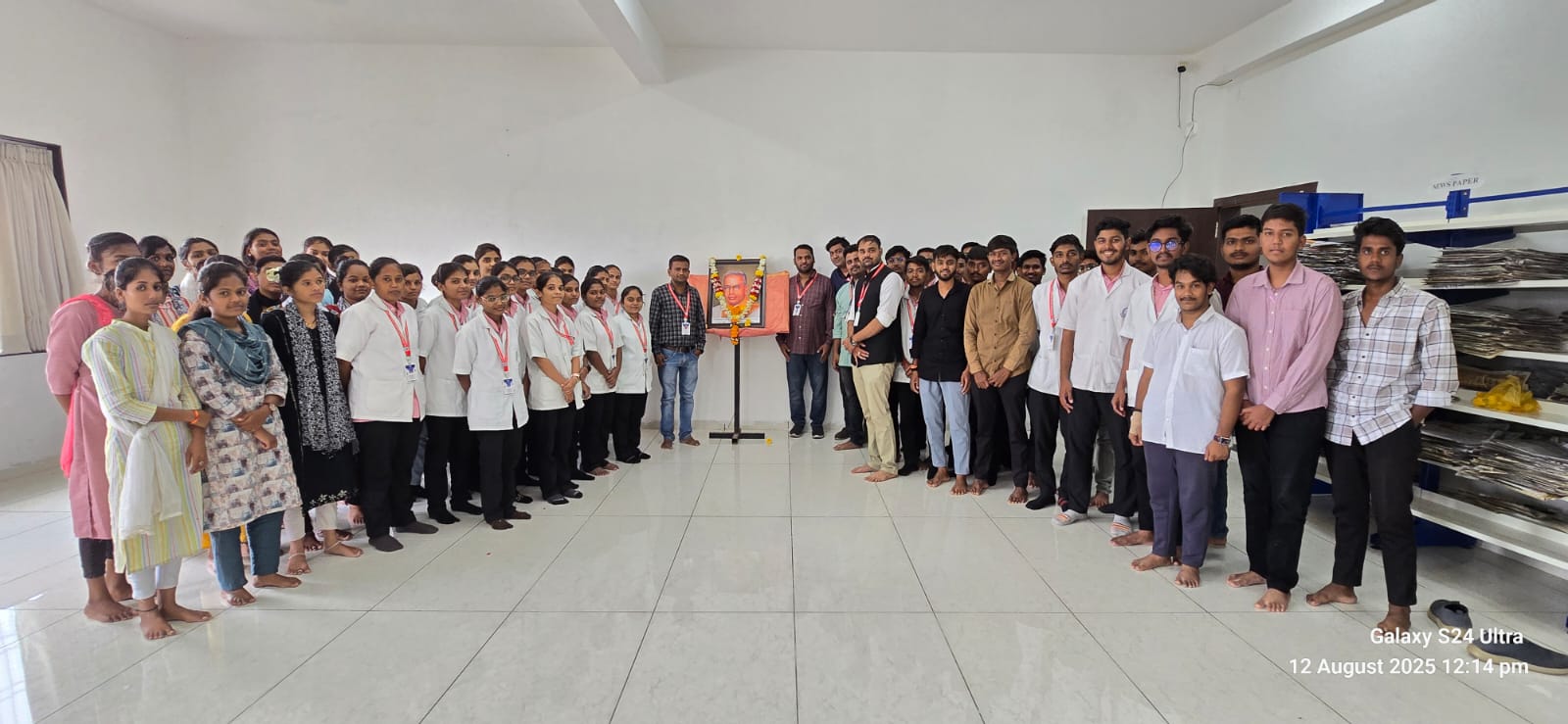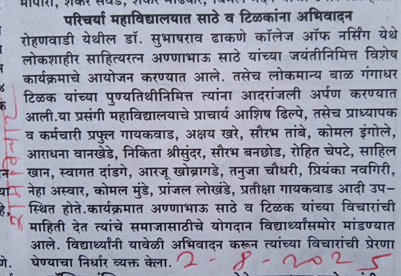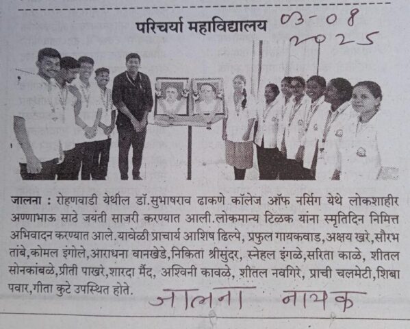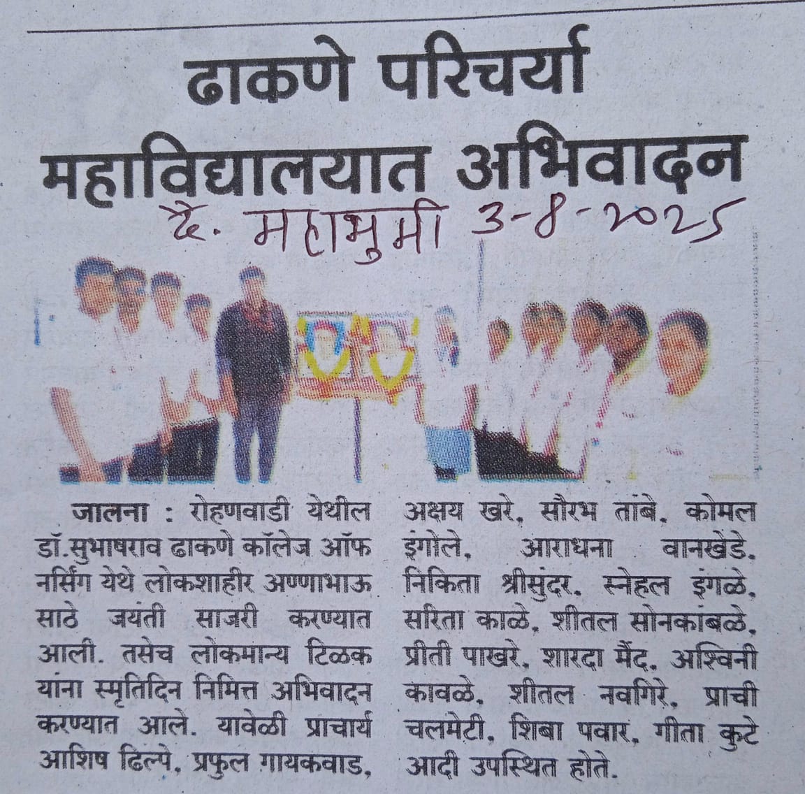 Dr. Subhashrao Dhakne Nursing College pays heartfelt tribute to Lokmanya Bal Gangadhar Tilak and Annabhau Sathe on their birth anniversaries.