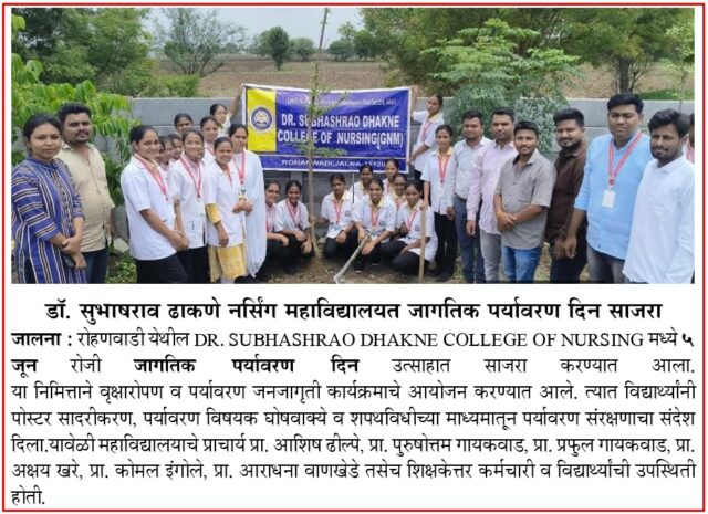 Dr. Subhashrao Dhakne College of Nursing celebrated World Environment Day with the theme of sustainability and green living. Students and staff participated in tree plantation, poster making, and awareness activities promoting environmental protection.